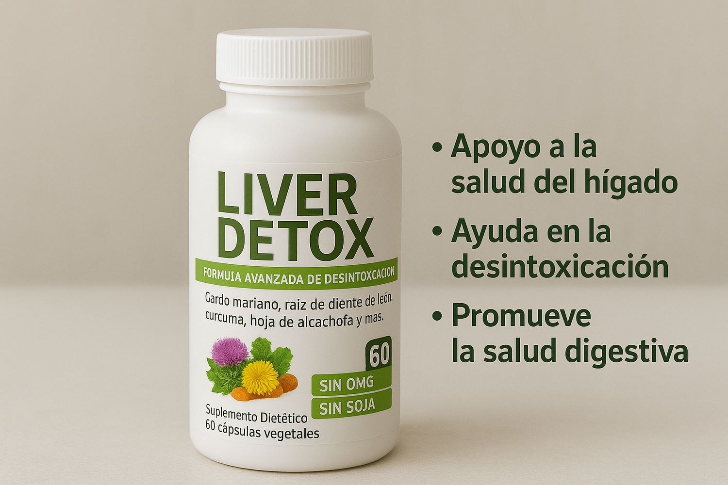 Liver Detox es un suplemento diseñado para apoyar la salud hepática, promover la limpieza interna del cuerpo y mejorar el bienestar general. Elaborado con ingredientes naturales como Cardo Mariano, Diente de León, Cúrcuma y Hoja de Alcachofa, ayuda al hígado a realizar sus procesos naturales de detoxificación.